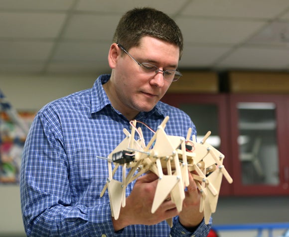 Instructor Kevin Dietsche examines a mechanical-electrical “scrawler,” a 12-legged walking device created by Matthew Harris.