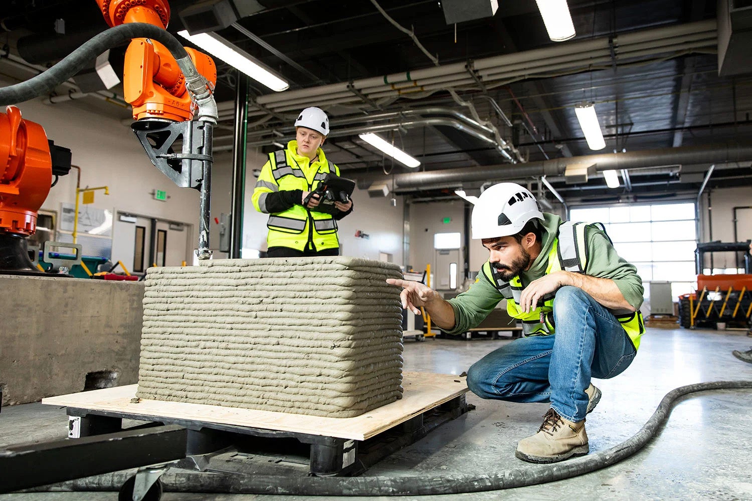 Workers inspect 3D printed concrete. / Photo courtesy Alquist