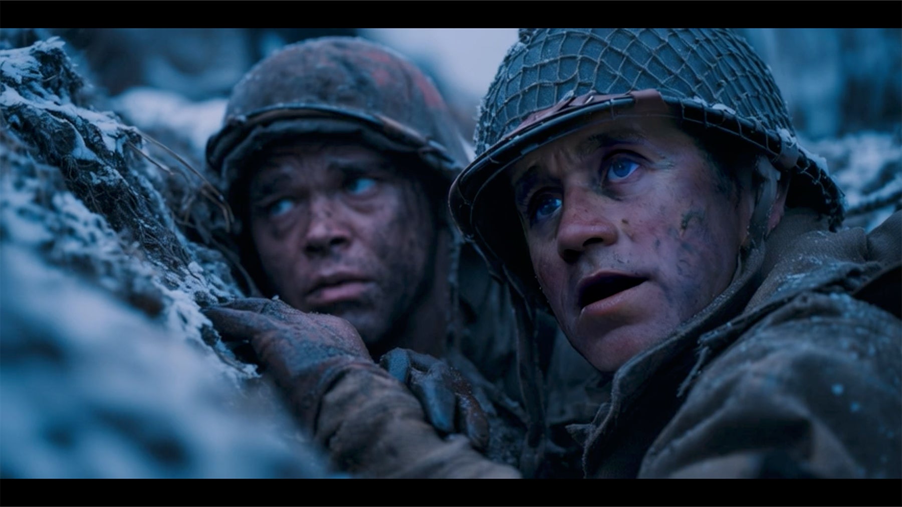 An AI test frame of two soldiers in a foxhole in World War II, during the Battle of the Bulge.