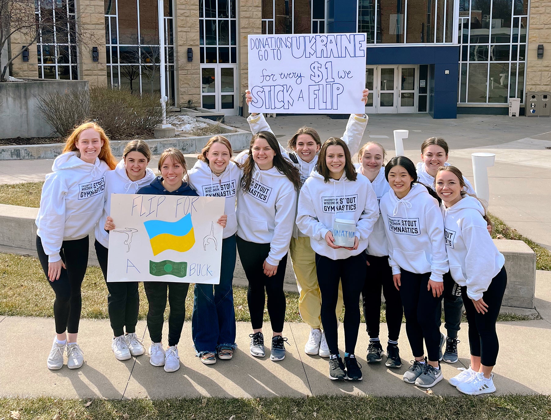 Competitive gymnasts in the U.S. are flipping — literally — for a fundraising challenge started by University of Wisconsin-Stout’s women’s gymnastics team to help provide humanitarian aid for the people of Ukraine.