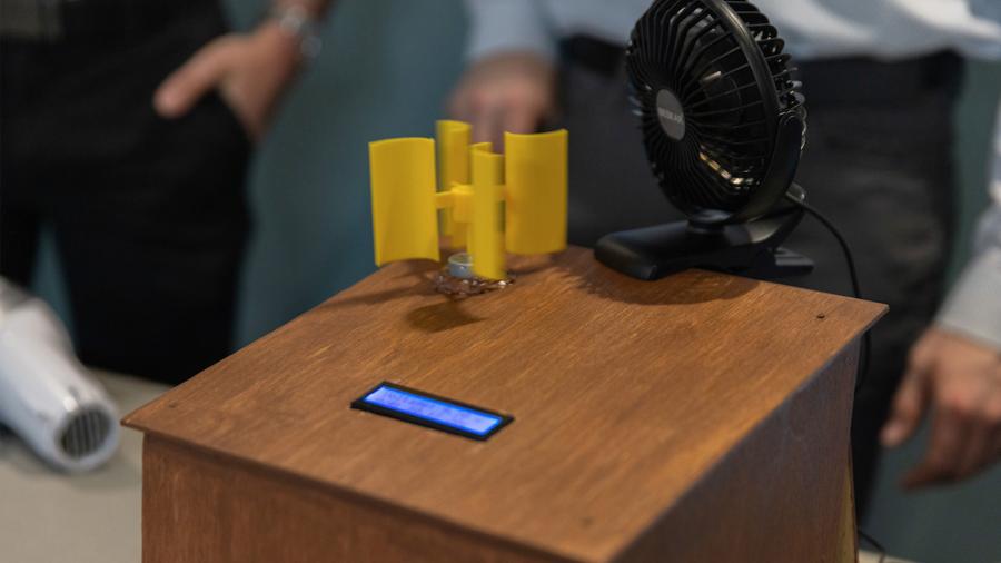 The team researched how different turbine blades and mounting placements would function. Their concepts included vertical blades mounted on a pole, like a windmill; horizontal blades mounted on a roof; and vertical blades mounted on a roof. They proceeded with the third concept for their prototype, based on energy produced and stored, energy output, wind efficiency, durability, safety, cost and usability.
