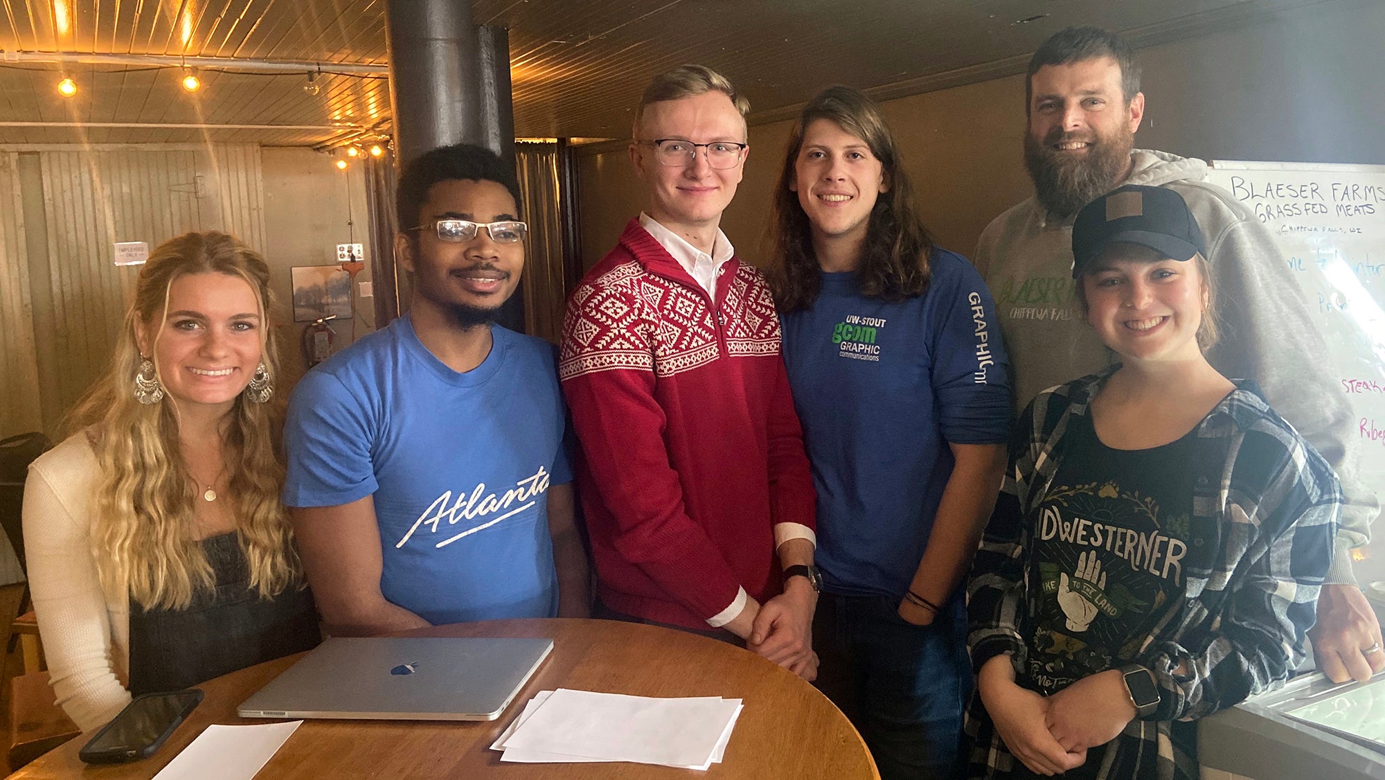 Josh Blaeser, owner of Blaeser Farms, second from right, with members of the UW-Stout Phoenix Challenge Competition Molly Perkins, at left, Nikolas Thomas, Eli Dupslaff, Matt Smith and Julia Otten.