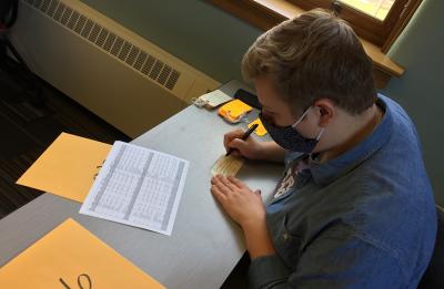 UW-Stout student Katie Ferguson fills out toe tags to be part of an art exhibit at the University Library. The tags represent migrants who have died trying to cross the Sonoran Desert to come to the U.S.