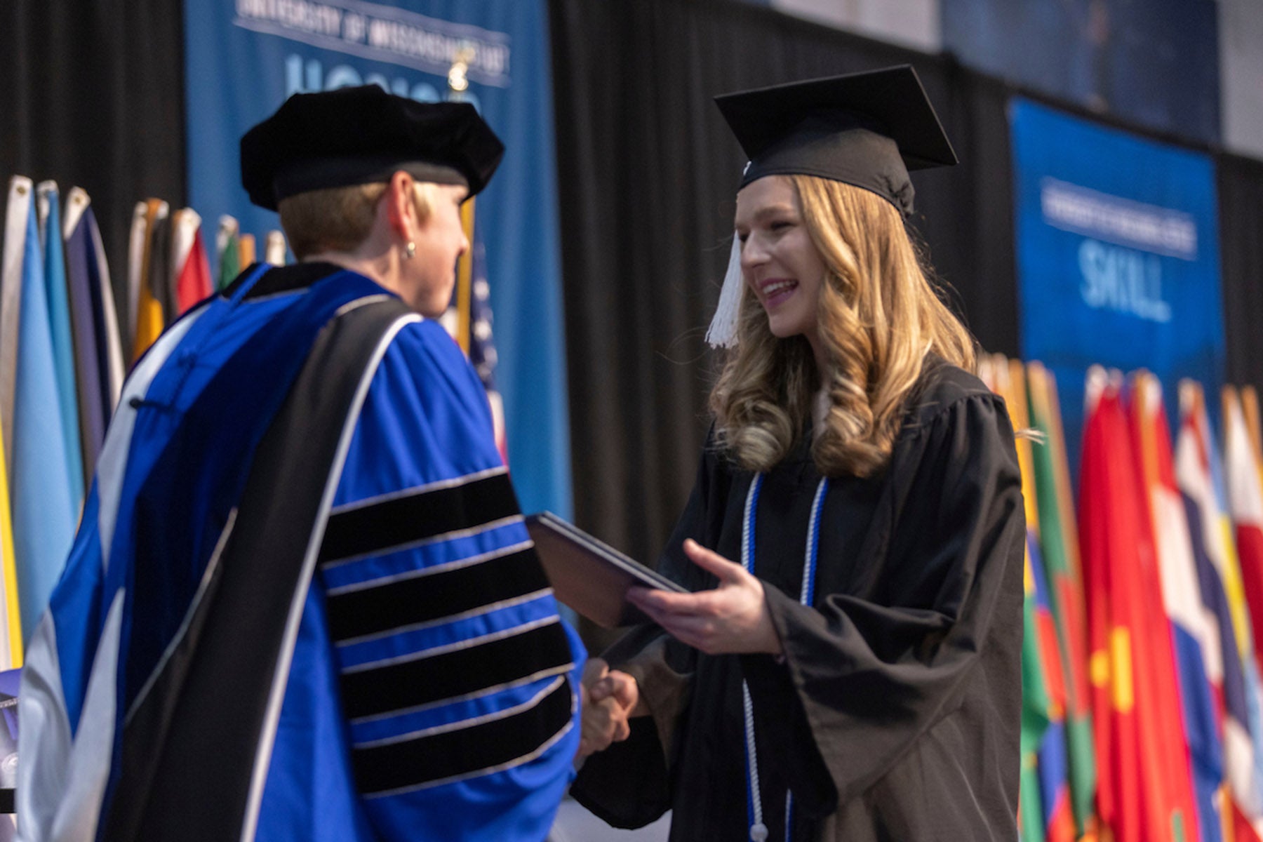With her goal in mind, Knudsen transferred her associate arts degree credits from Anoka-Ramsey Community College to UW-Stout and earned her Bachelor of Fine Arts in graphic design and interactive media. She pushed through personal struggles and graduated on May 6, one of 1,173 graduates.