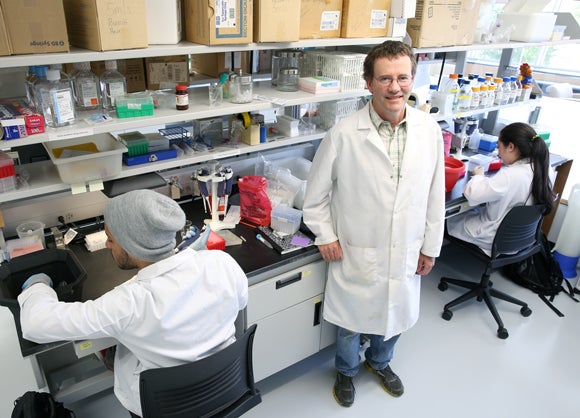 Biology Professor Jim Burritt works on the honey bee research project with students Matheus de Jesus and Viviane Oshima in a UW-Stout biotechnology lab / UW-Stout