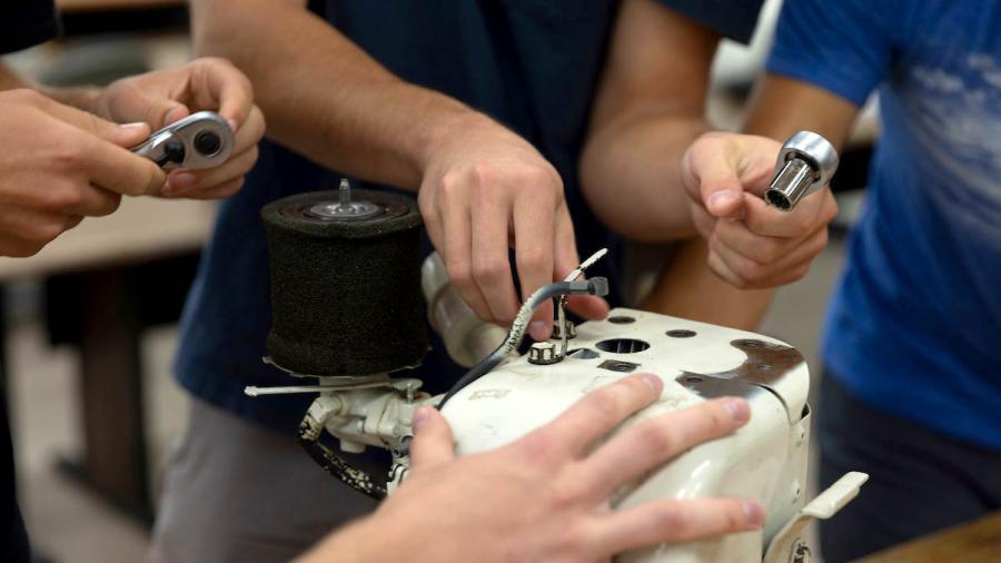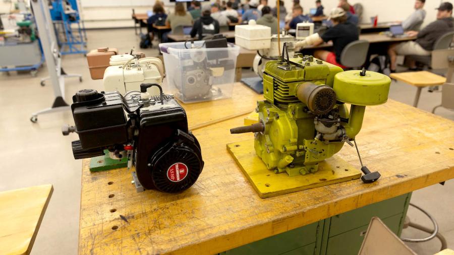 The engines await at worktables throughout the Jarvis Hall Tech Wing lab. An echoing hum of the ventilation system and the insect-like buzz of overhead lights accompany the clank of metal on metal and the asynchronous clicks of half a dozen ratchet wrenches.