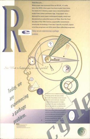 This is the era of the computer which in this field leads to much controversy in many cases. People in the Graphic Design area are arguing about the extent to which the computer can be used and who should be using it. These arguments are legitimate in the sense that it could possibly create an overabundance of poor design and less 'Design' oriented jobs. The computer does have its draw-back and limitations and the more involved a person gets with the systems the more exclusive things seem to be, however it is one of the most efficient means of communication and if used as an end tool instead of the sketch board, it can offer so much more to design. When I began this endeavor I had very little experience on the computer but this project has helped me gain an understanding of computers that I would not otherwise have. The number of programs and color output systems that I have dealt with have given me valuable experience and helped me grow to be a more fluent designer. This opportunity has come at a perfect time for me because I have had time to experiment with type and design before using the computer. This creates a balance that brings art and technology together. It's important to have a solid base of design before getting involved with computers otherwise it's too easy to design within the limitations of the computer instead of pushing the computer to do more to aid the initial design concept. It is my hope that these posters generate interest in design as well as the technology that helped produce them and make people aware that technological advancement in design processes can also help the environment. My main intent for the viewer is to experience a different kind of art. These posters are to serve as informative pieces and to function as works of art. Each person who looks at these posters will see something different and will hopefully walk away having learned something new. The relationship of art to technology is one that can take many routes - but to bring them together as equals is the most difficult. My original intent was to create a line of product packages that would reflect the evolution of typography and address the current issues on recycling. These packages were to be produced via the computer which would bring the theme of art and technology into play with the sub-themes of recycling and type. This proved to be more complicated and far too in-depth for practical application and was therefore altered to better accommodate the time allotted. My original theme of recycling is being used but to a more specified degree. Paper recycling took the place of recycling in general and the evolution of typography was dropped altogether. The idea of creating recycled packaging was changed into a series of posters which addressed the issue of paper recycling. This series of posters is to function as an educational set for the general public. They address issues of paper recycling and give specific facts and methods which can be made useful on a local and national level. The entire educational package includes four floppy Macintosh compatible disks, two Syquest disks for a 44 MB removable hard drive, two research books to illustrate the design and thought process, and the eight posters encased in a portfolio. To maintain my original route of product packaging I have also developed labels to bring the items together as a visual set. Although I have deviated somewhat from the original proposal, the main themes still hold true and accentuate the relationship of art to technology.