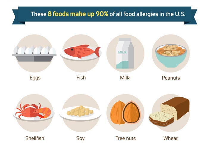There are 8 major allergens that make up approximately 90% of food allergies. These are wheat, eggs, milk, soy, crustacean shellfish, fish, tree nuts, and peanuts. There are more than 160 foods that have been known to cause food allergens. Food allergies can be confirmed through testing with a physician.